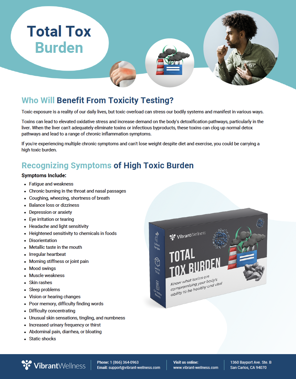 Through this partnership, members can access the Vibrant Wellness Total Tox Burden panel, which measures the body’s toxic load from three critical categories - Environmental Toxins, Heavy Metals, and Mycotoxins - providing a comprehensive look at how accumulated exposures may be impacting overall health.